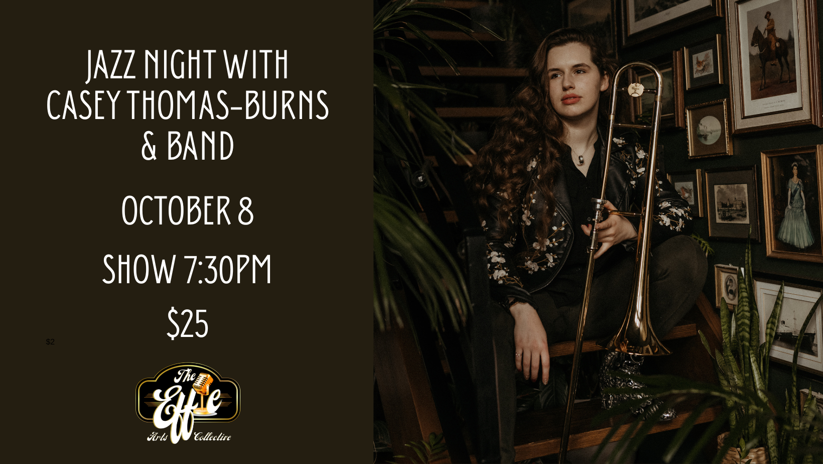 Tickets: https://app.ticketowl.io/aCS6dbYjvdJ0dlx3/event/aMxFsfOgWhdKVrDZ Jazz is back at The Effie! “Swingin’, singin’, and sparkling,” trombonist and vocalist Casey Thomas-Burns brings infectious energy and compelling artistry to the Canadian jazz scene. Drawing inspiration from artists Urbie Green, Sarah Vaughan, J.J. Johnson, and Bria Skonberg, Ms.Thomas-Burns leads her quartet - featuring Dean Thiessen, Riley Poystila, and Clement Pytel -... |